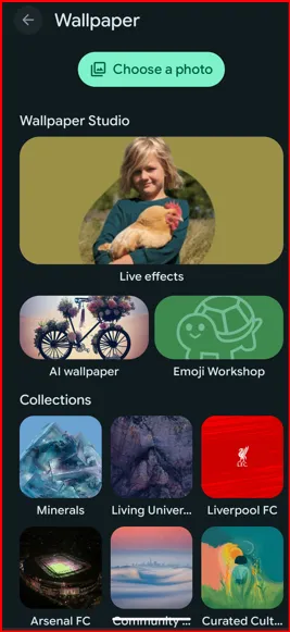 You can view the various categories of wallpapers (Wallpaper Studio), including Live Effects (Available only on Android 16), AI Wallpaper, Emoji Workshop, Minerals, Living Universe, Liverpool FC, Arsenal FC, Google Arts & Culture, Motif, and more.
