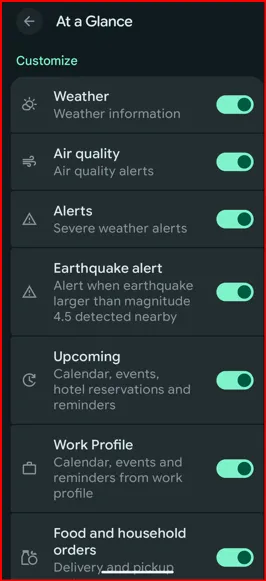 Using the Pixel 10 At a Glance feature, you can personalize settings to display content relevant to you, such as weather, events, and commute information. Toggle on the option you want to access from the lock screen.