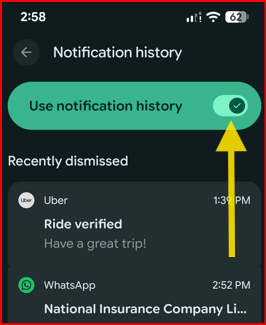 Settings > Notifications > Notification history > Toggle on Use notification history